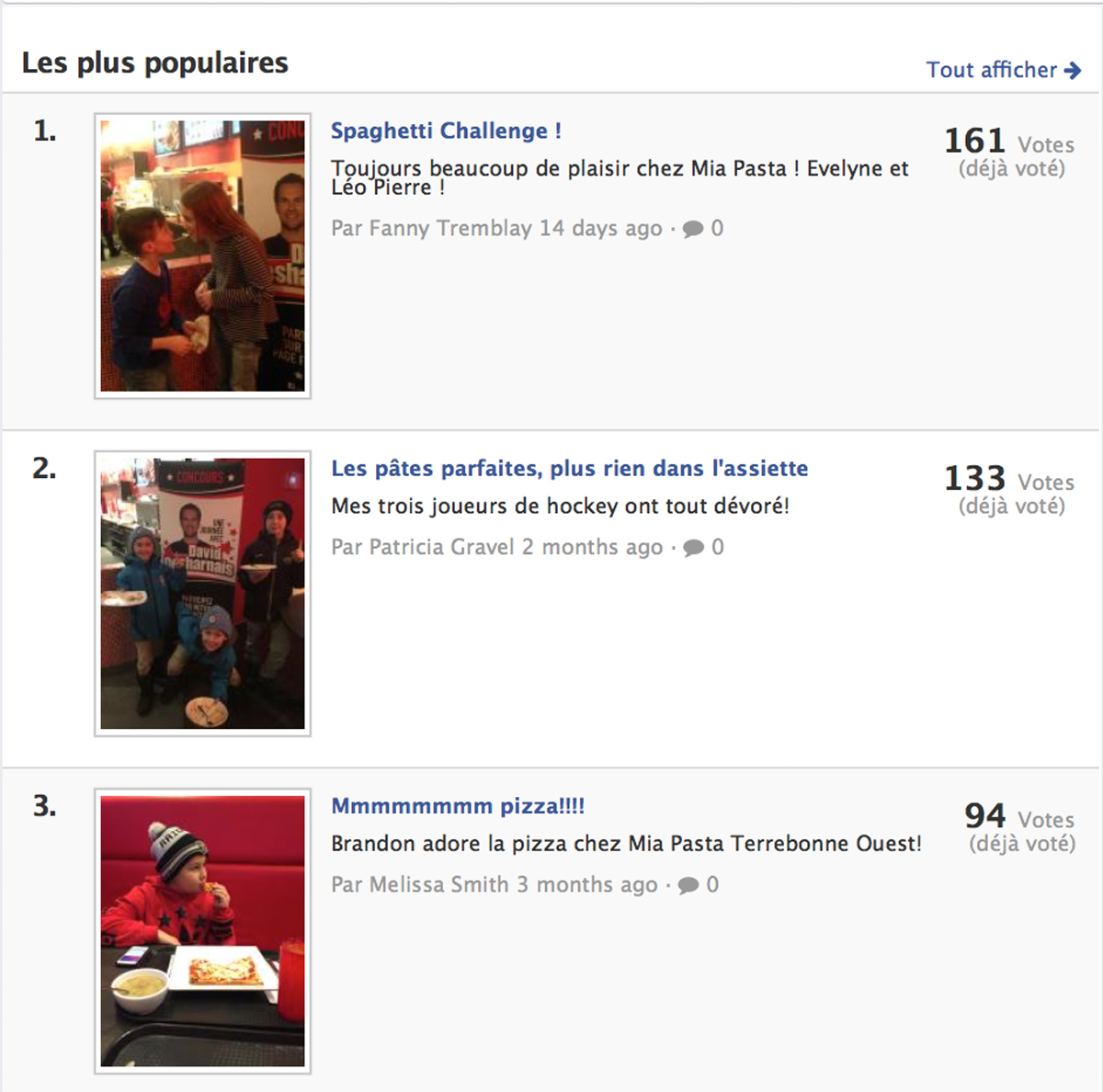 Mia Pasta Restaurants and 30&1 held a Facebook contest entitled ” A Day with David Desharnais”. The contest invited participants to take a selfie in a Mia Pasta restaurant, and then try to get the highest number of votes. The winner and fourteen (14) of his/her friends would spend a day with Montreal Canadiens player David Desharnais. More than 6,000 fans have visited the contest page, and a few thousand votes have been registered.